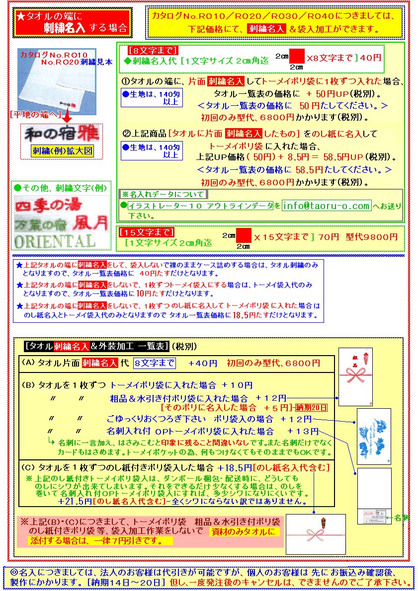 ▼刺繍名入れの場合、金額は針数計算となりますので、原寸サイズの色付きデータを送付後、お見積りとなります。 [刺繍代は、針数計算のため、細い線でワンポイント的に入れるのが安く仕上がります。刺繍位置とデータを送付下さい。]