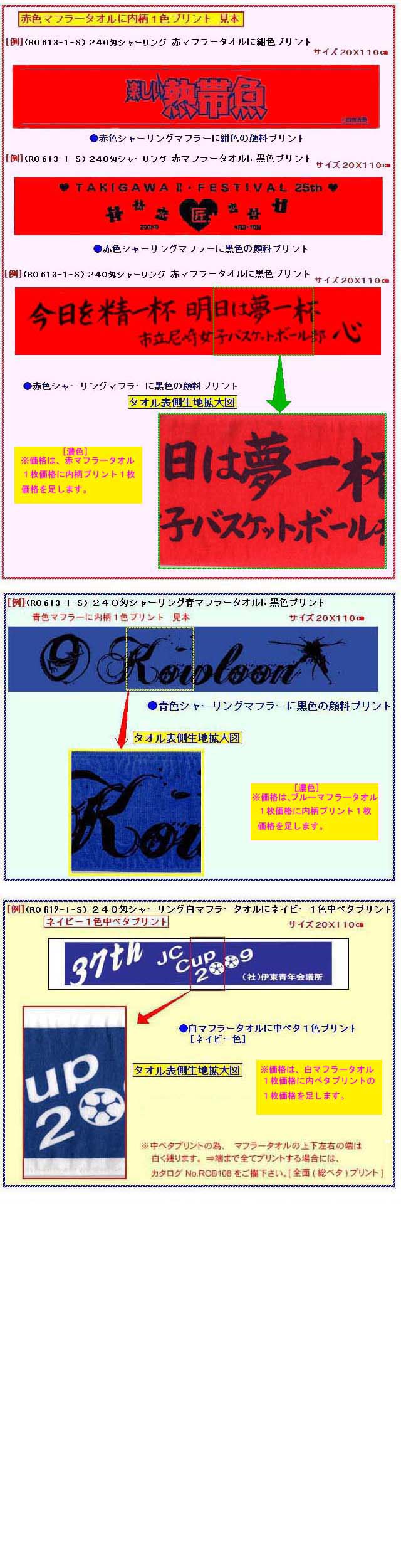 [●人気の赤マフラーに1色名入れして1枚160.8円/青マフラーも同じ。]