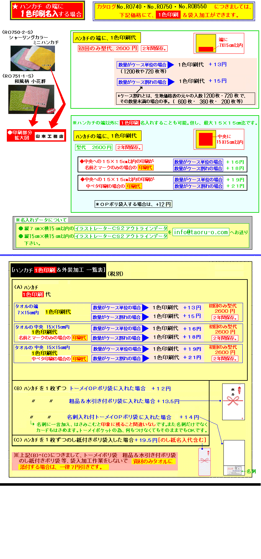| ■[ご注文方法](端へ1色印刷/中央へ1色印刷の場合) @各生地ページ下部の注文画面より、商品番号・商品名・枚数・金額をご記入いただき、ご注文下さい。その時に必ず、備考欄にデザインデータ別途送付とご記入下さい。 A次に商品タイプが決まりましたら、[指定ロゴやマーク・キャラクターがある場合には] 生地サイズに併せた原寸イライトレーター10 色別アウトラインデータを info@taoru-o.com へ送付してください。 ■文字と数字のみの場合は、下記のワード用テンプレートにて、デザイン作成可能です。該当するものをダウンロードいただき、作成後、送付ください。 ◆タオルハンカチ20X20p(7X15p名入)テンプレート ◆タオルハンカチ20X20p(15X15p名入)テンプレート ◆タオルハンカチ25X25p(7X15p名入)テンプレート ◆タオルハンカチ25X25p(15X15p名入)テンプレート ◆タオルハンカチ14X14p(9X9p名入)テンプレート |