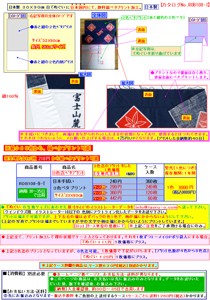 | ●下記、他のベタプリント 見本ページへ ■下記の にじみ・色ムラ部分 生地拡大図 は、この文字をクリック。 ※[小口プリントの注意点]--60枚・36枚の場合は、枚数が1枚〜3枚くらい切れる場合がございます。(B品除く為) 返金対応します。 ■ご注文方法 @本ページ下記の注文画面より、下記の商品番号・商品名・枚数・金額をご記入いただきご注文下さい。その時に必ず、備考欄にデザインデータ別途送付とご記入下さい。 ↓下記以降のデザイン確認は、@注文画面より商品名・枚数をご注文後に行ってください。[無料デザイン確認の為。@を行っていない場合は有料となります。] A次に商品タイプが決まりましたら、下記デザイン作成の注意点をご覧いただき、生地サイズに併せた原寸イライトレーター10 色別アウトラインデータを info@taoru-o.com へ送付してください。 |