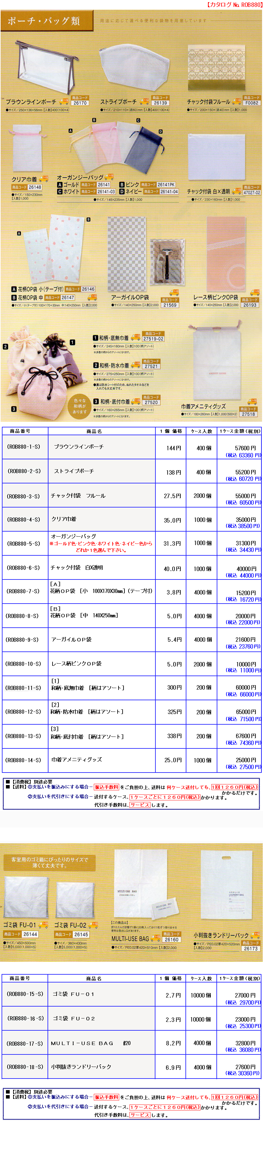 ●カラージッパーバック3.5円/不織布バック9.7円/ランドリーバック6.9円/サニタリーバック2.6円/ゴミ袋0.97円/スリッパ中敷き11円