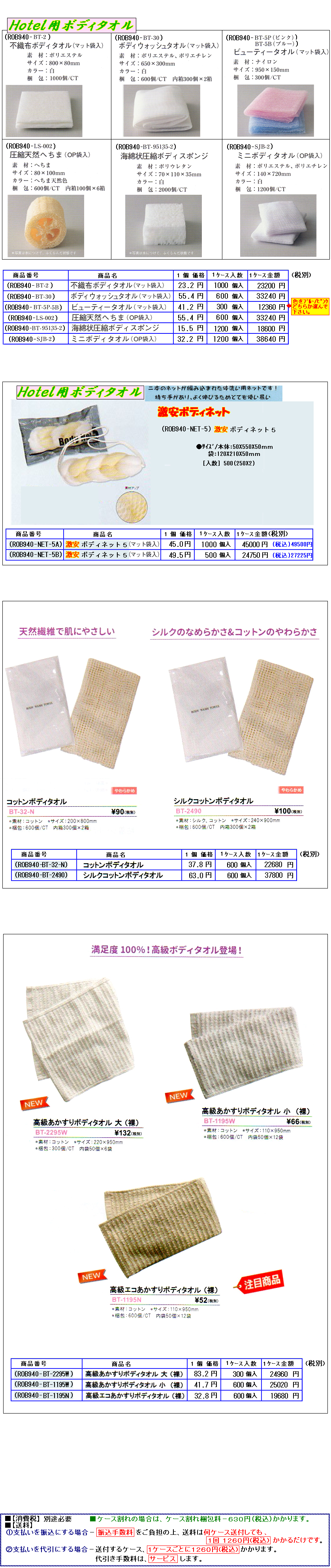 ▼(RPB940-BT2)不織布ボディタオル 拡大図へ ◆ホテル用ボディタオル(スポンジ)次ページへ